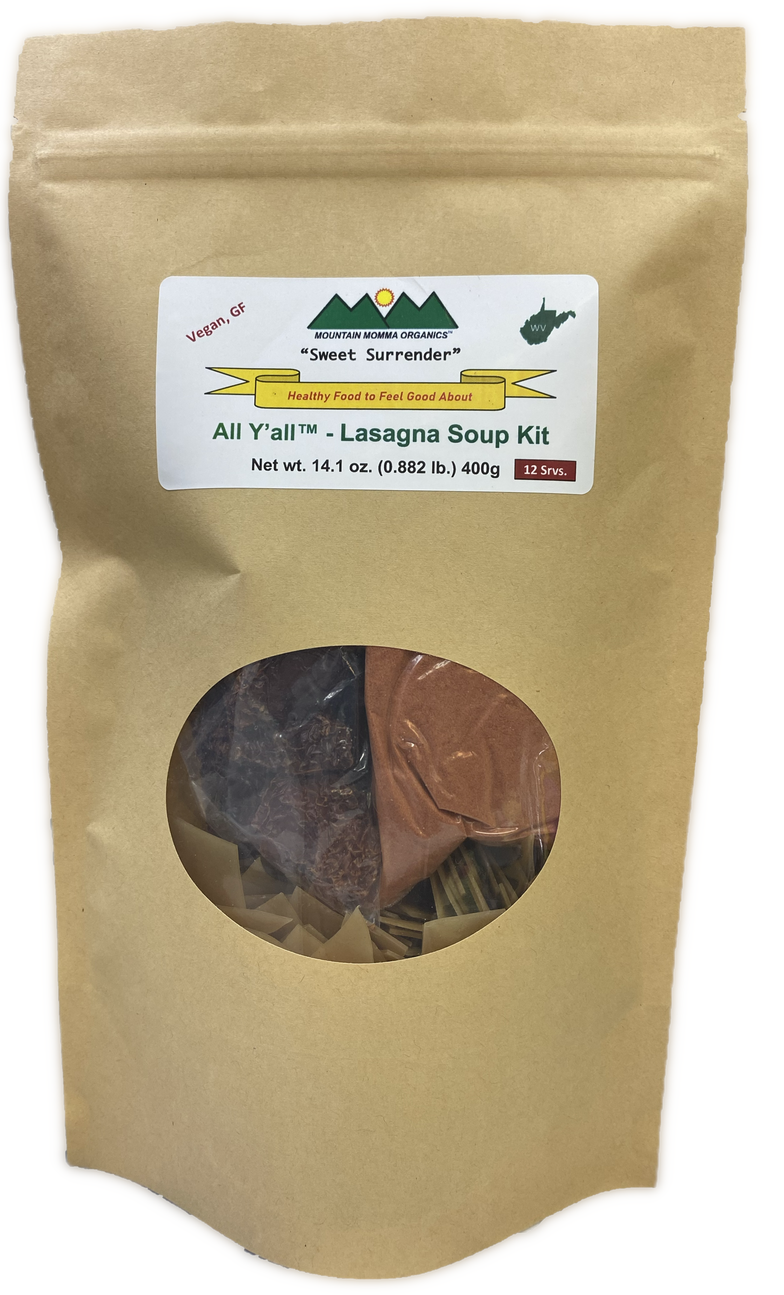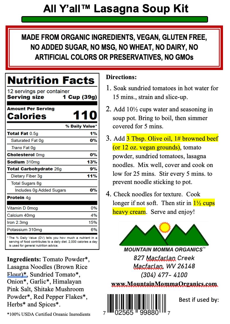 An Italian style hearty lasagna soup kit that is rich in savory flavors. This package makes at least 12 servings (1 cup each). You can divide the recipe, or you can make it all up at once and freeze left-overs in portions for later reheating. Serve with a side salad and fresh garlic bread for the ultimate comfort food combo. Experience the delicious taste of strictly organic ingredient foods from Mountain Momma Organics.
