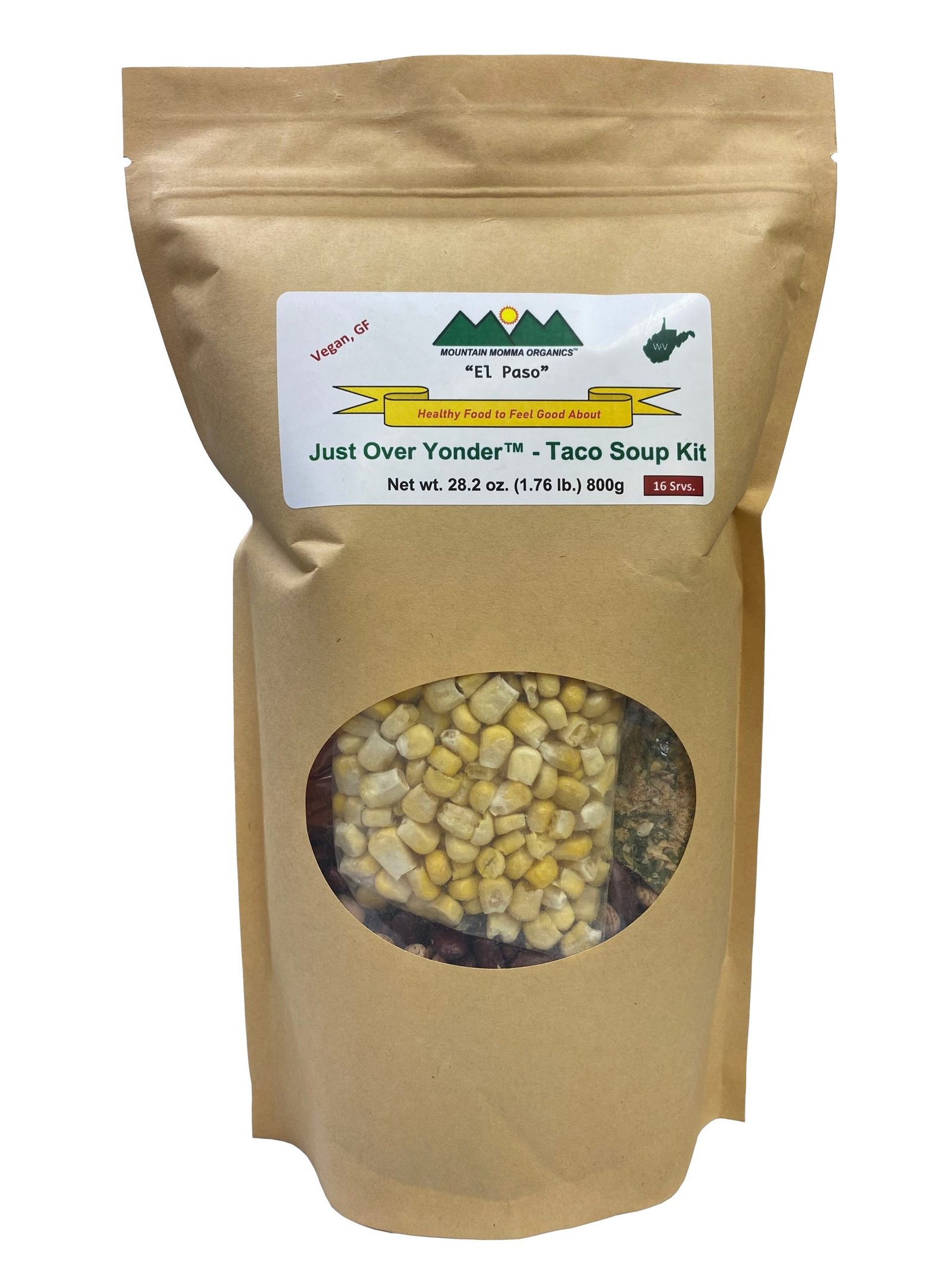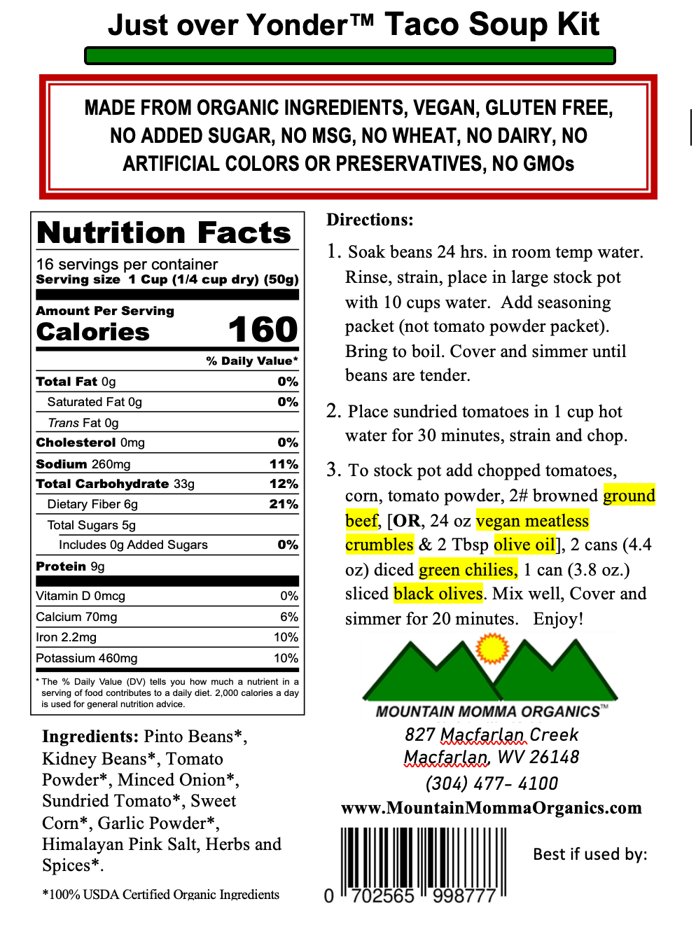 Our Taco soup kit makes 16+ big servings. You know you’ve purchased something substantial when you feel the 1-3/4 pounds of Net Weight. This taco soup is hand made by us from 100% USDA Certified Organic Ingredients. The soup is gluten-free, vegan (many customers add meat), No added sugar, No MSG, No Wheat, No Dairy, no GMO’s, and no artificial preservatives or colors. This is a thick hardy soup that tastes much like a taco.